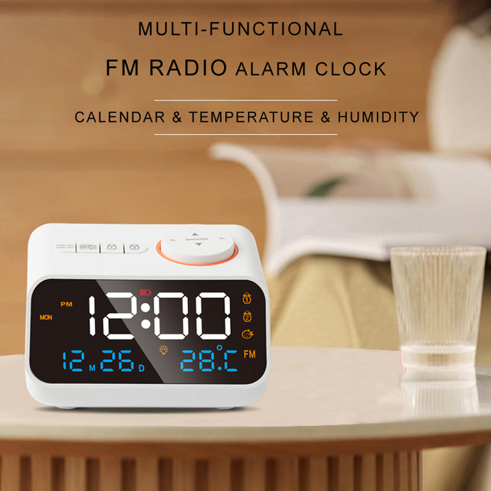 - Mordern FM Radio LED Alarm Clock for Bedside Wake Up. Digital Table Calendar with Temperature Thermometer Humidity Hygrometer.