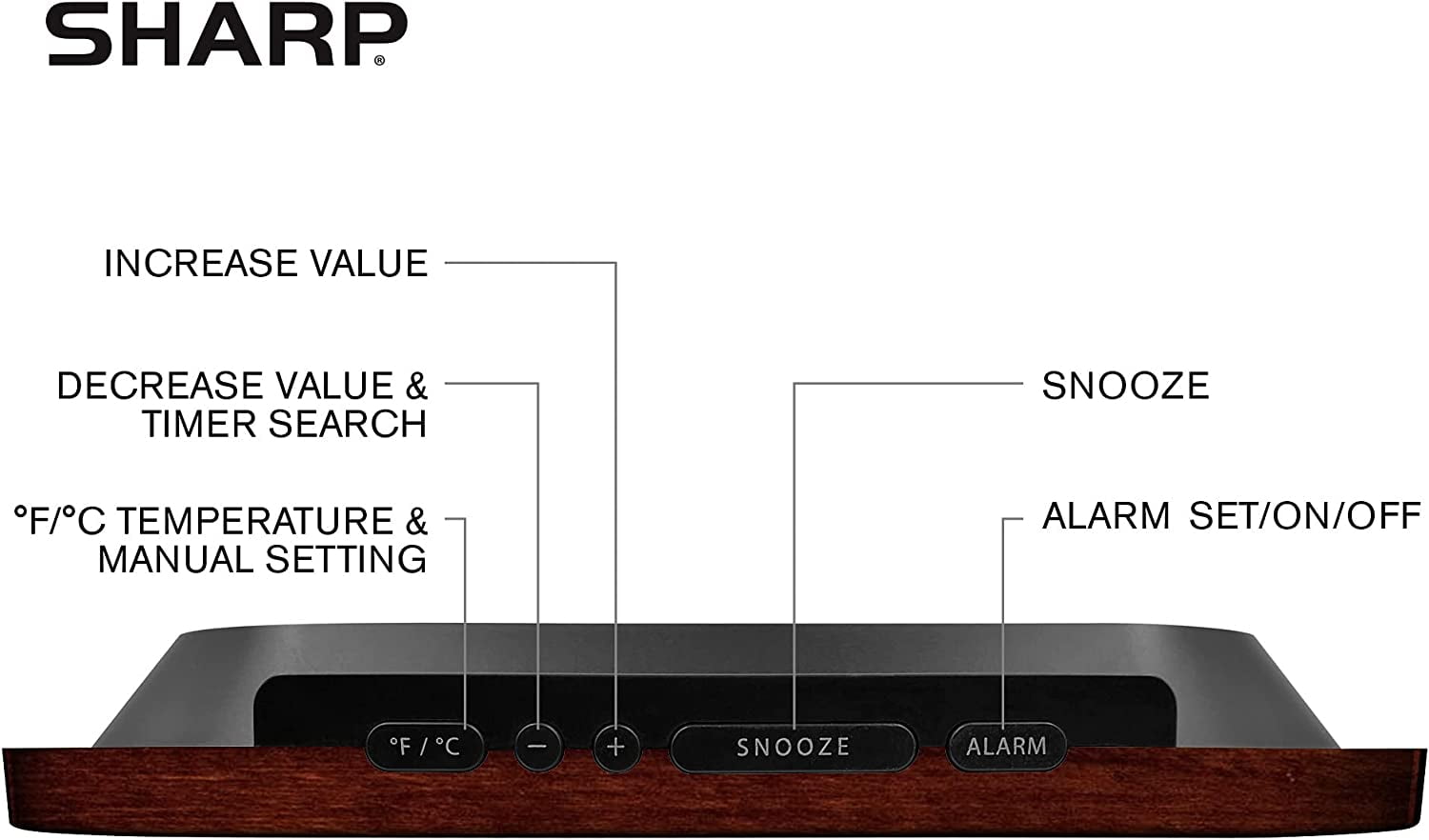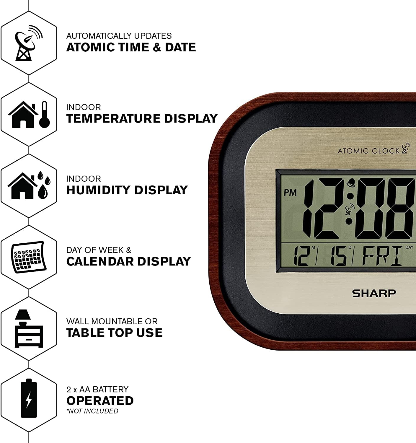 Sharp Digital Wall Clock, Self-Setting Atomic Desk Clock with Temperature, Humidity and Date, Battery Operated Digital Clock Large Display, Bronze Woodgrain finish with Gold Bronze Accents. Atomic Accuracy: The Atomic clock has a built-in receiver that automatically synchronizes itself with the WWVB radio broadcast by the US Government’s National Institute (NIST) in Fort Collins, Colorado. The Atomic Clock will always be accurate to within one second as it receives daily WWVB updates. Displays Indoor Temperature and Indoor Humidity. Easy to Read 1.65” Tall LCD Time Display - Easy to See, Easy to Use, Easy to Set up - Use as either a wall clock, or as a desk clock with integrated stand. Perfect for anyplace in your home. Displays calendar and day of week – Shows month and date and day of the week for easy viewing at a glance. Battery powered: Requires 2 x AA batteries (not included). (SPC1019CEAMZ)