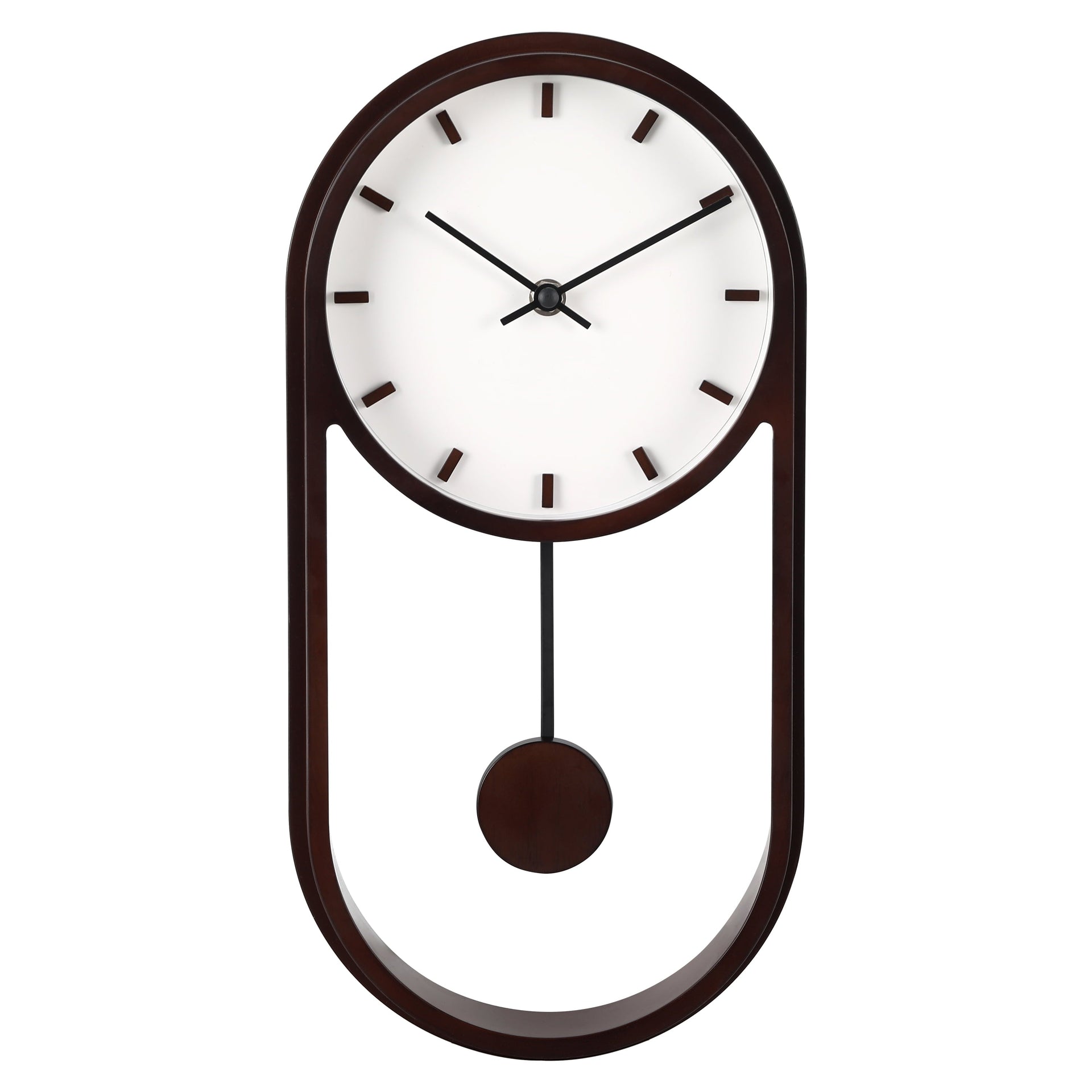 Introducing the 15.5” Better Homes and Gardens Modern Pill Shaped Pendulum Wall Clock - a swinging pendulum clock that adds a chic elegance to any space. Measuring 15.5 inches tall by 7.8 inches wide, this timepiece is the perfect size for making a bold statement in any of your home’s rooms! The warmth and sophistication of the clock's brown mahogany finished frame captures the eye immediately. Its on-trend, pill-shaped silhouette is an elevated expression of modern design, carefully crafted to spark your inner design spirit. The matte white dial is accented with raised hour markers, a blend of contemporary style and elevated elegance. The contrasting black metal handset feature a minimalist silhouette. This clock is not just a functional timepiece, but a design statement where style meets function. Its modern core and chic design make the pendulum wall clock a fashionable addition, sure to infuse any room with modernity. Easy to hang on the wall, it's a testament to the idea that design, indeed, meets function. This Better Homes and Gardens Modern Pill Shaped Pendulum Wall Clock is a true blend of elegance, warmth, and contemporary style.