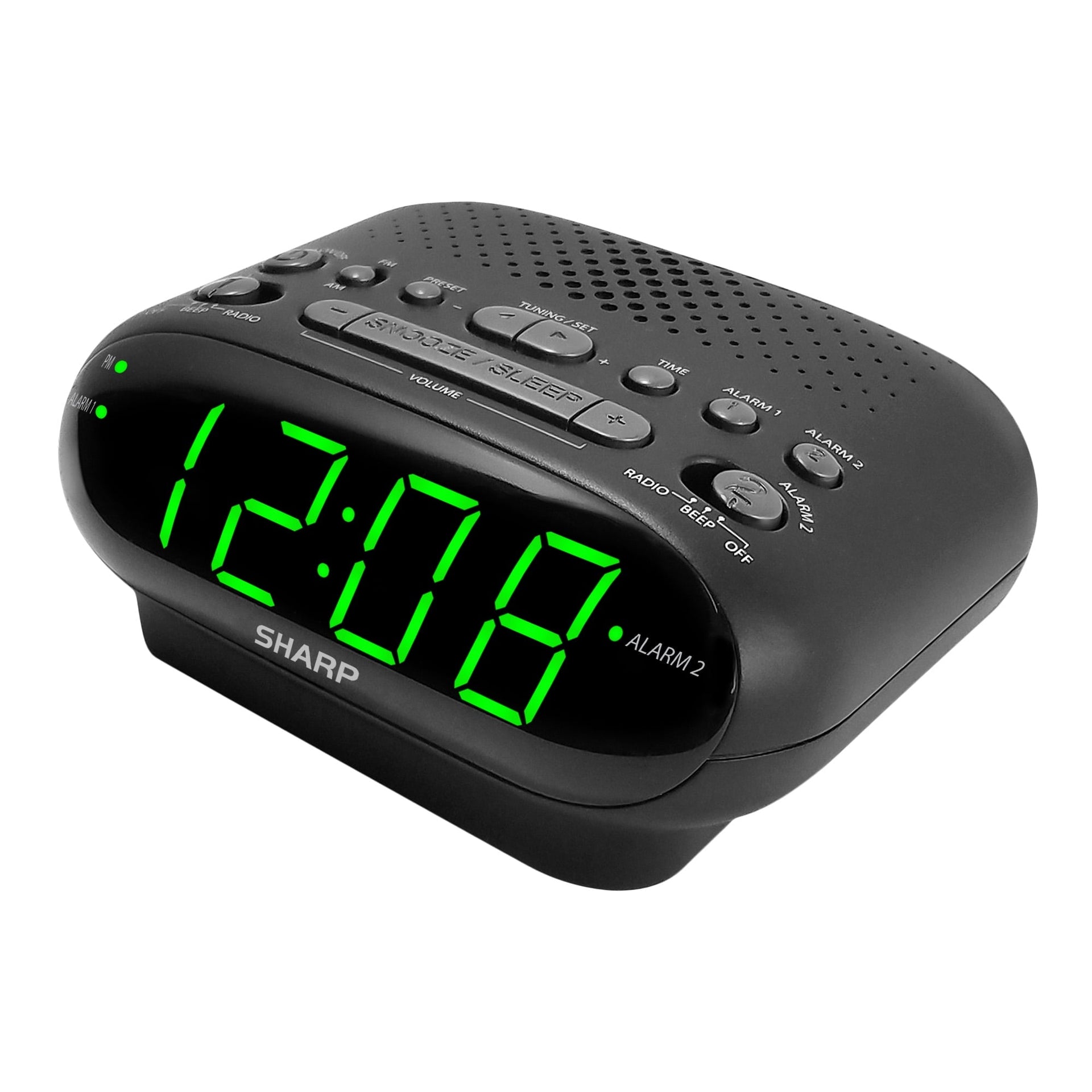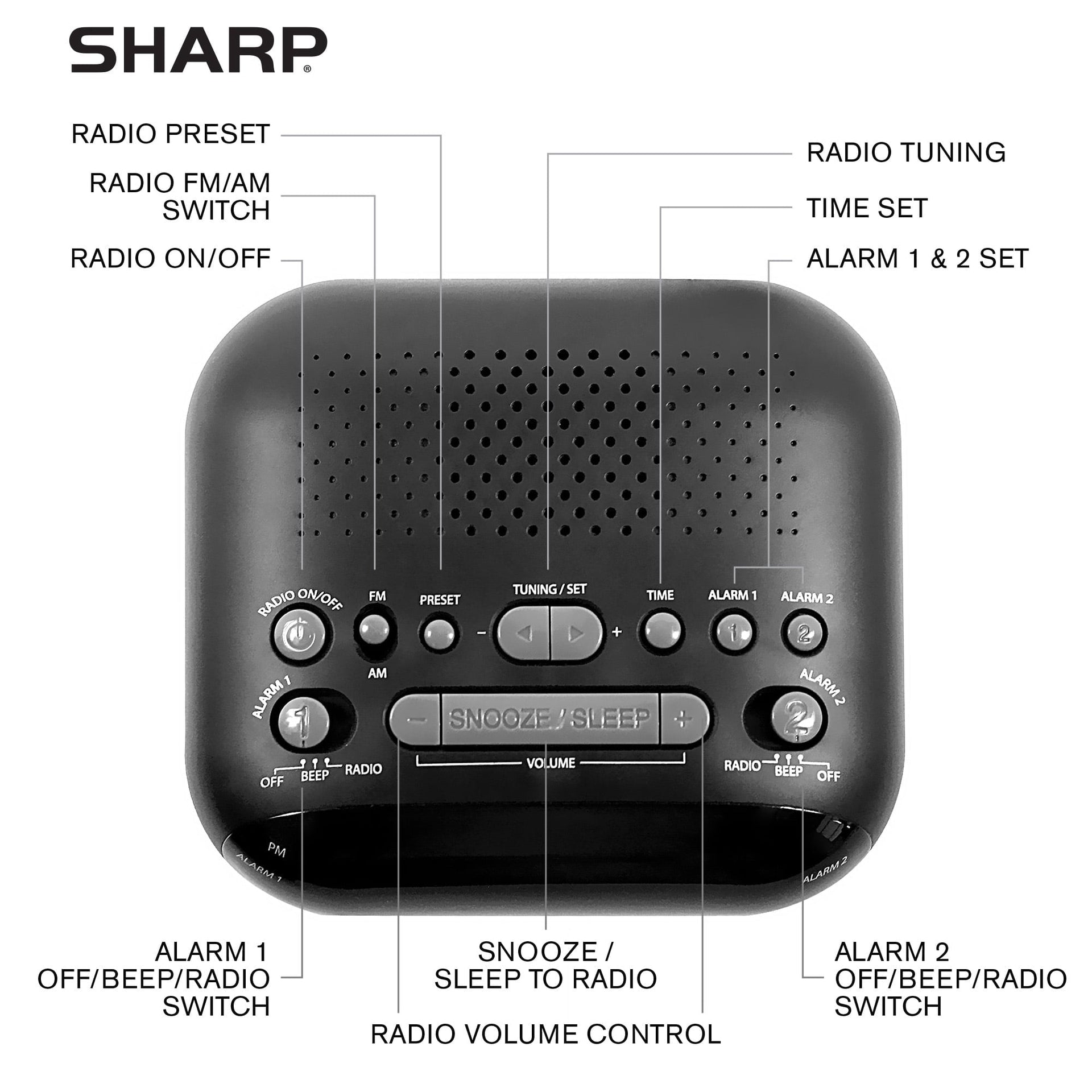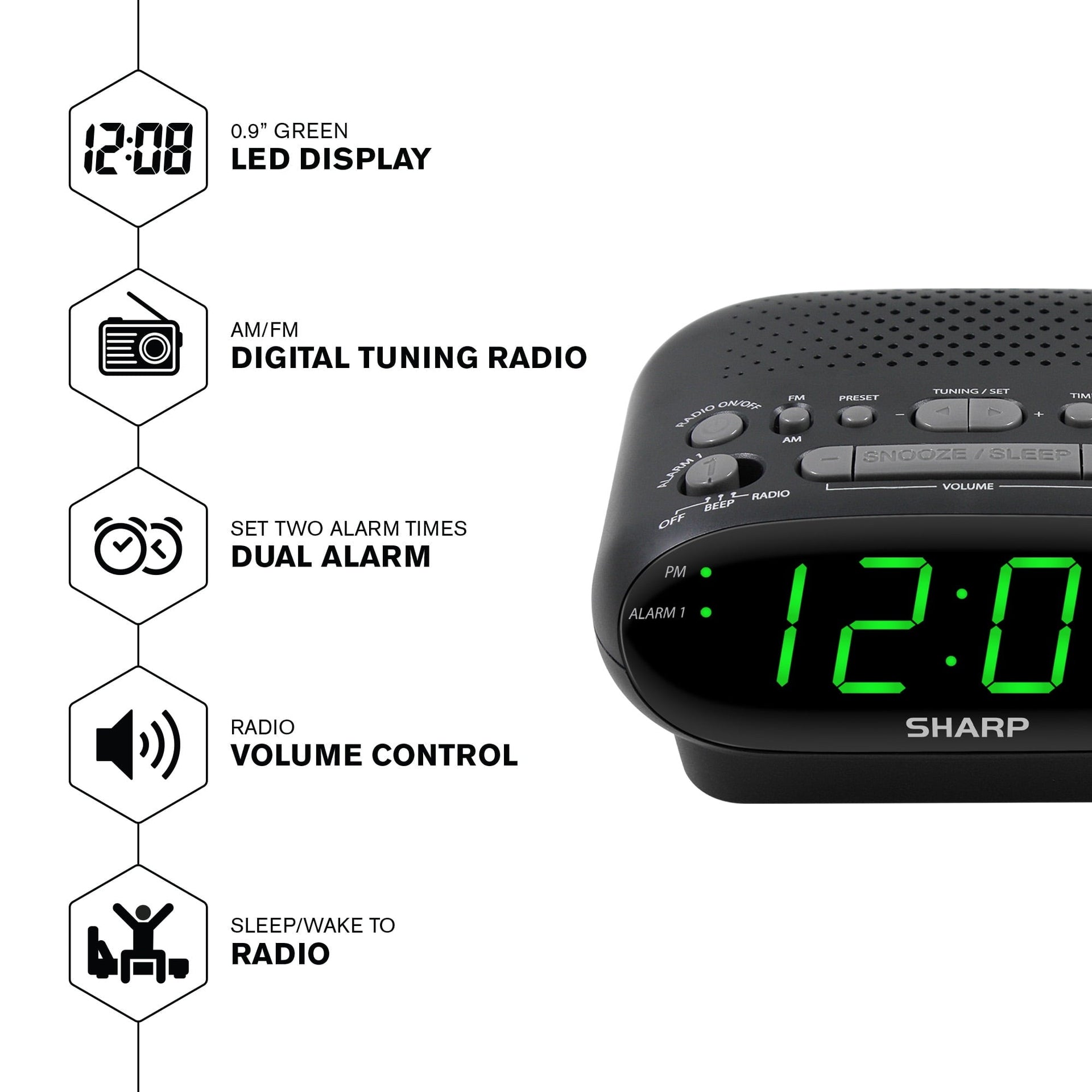 BEAUTIFUL DESIGN, SOLID CONTRUCTION AND ROOM FILLING SOUND: The Sharp SPC695AGAMZ AM/FM Clock Radio is the perfect device to play your favorite songs form the AM or FM band of raido. You can also simply tune in to your favorite AM or FM Radio Station and save them with up to 10 presets. Enjoy high quality sound performance thanks to the quality Bluetooth speaker and high-end design and construction. 0.9" Green LED display, AM/FM Radio, Stores 10 Radio Presets, Sleep to Radio / Wake to Radio, Dual Alarm, Easily Accessible Top Control Buttons, Snooze Alarm, Optional Battery Backup (Requires 2 x AA Batteries, Not Included), Electric Operated (AC Adapter Included)