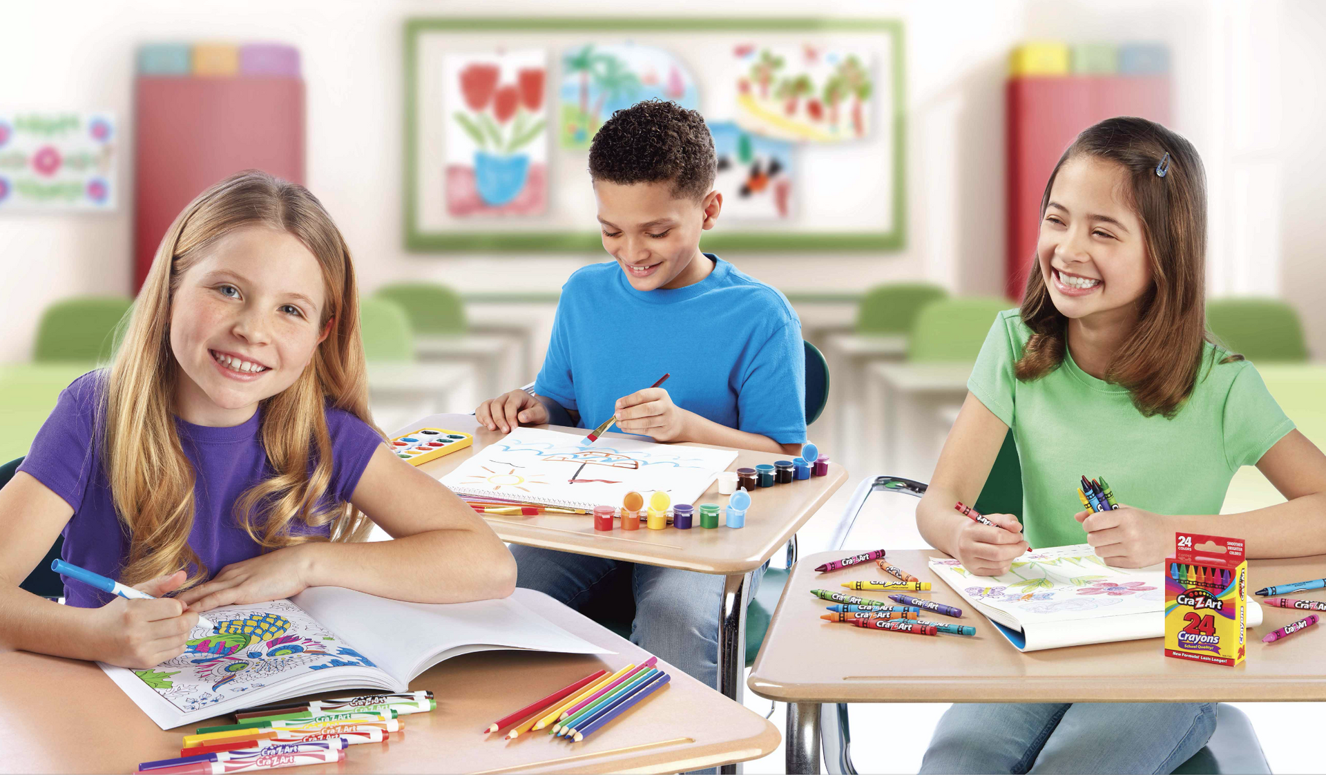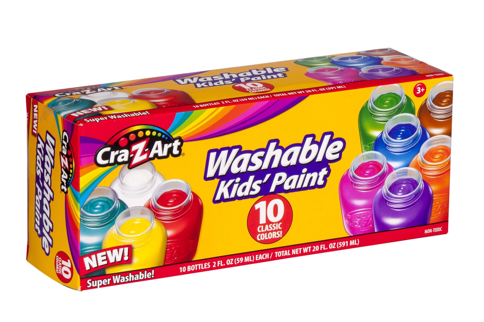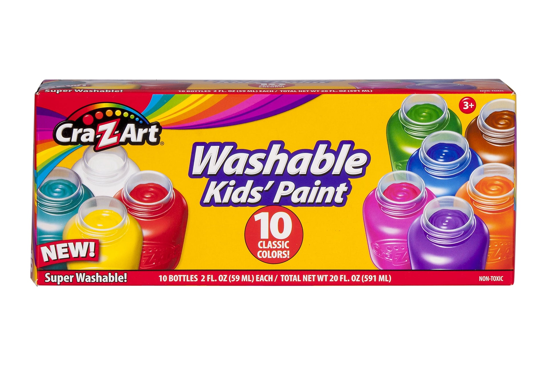 The Cra-Z-Art Multicolor Washable Kids' Paint is a value 2 oz 10-count! Wide-mouthed bottles allow for easy access, and they are also resealable for storage and so the paint does not dry out. The classic colors include primary and secondary colors, and are perfect for school projects, signs, banners, display boards, finger and hand painting, and more! All-purpose, water based gloss paints wash easily from skin and most children's fabrics with soap and water. Safe and nontoxic. For ages 3 and up. Save on your back-to-school list with savings from Cra-Z-Art school supplies. Be "always creative" with Cra-Z-Art!