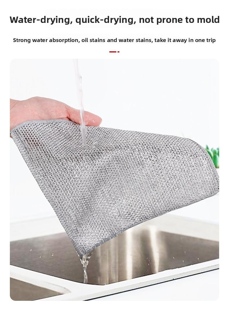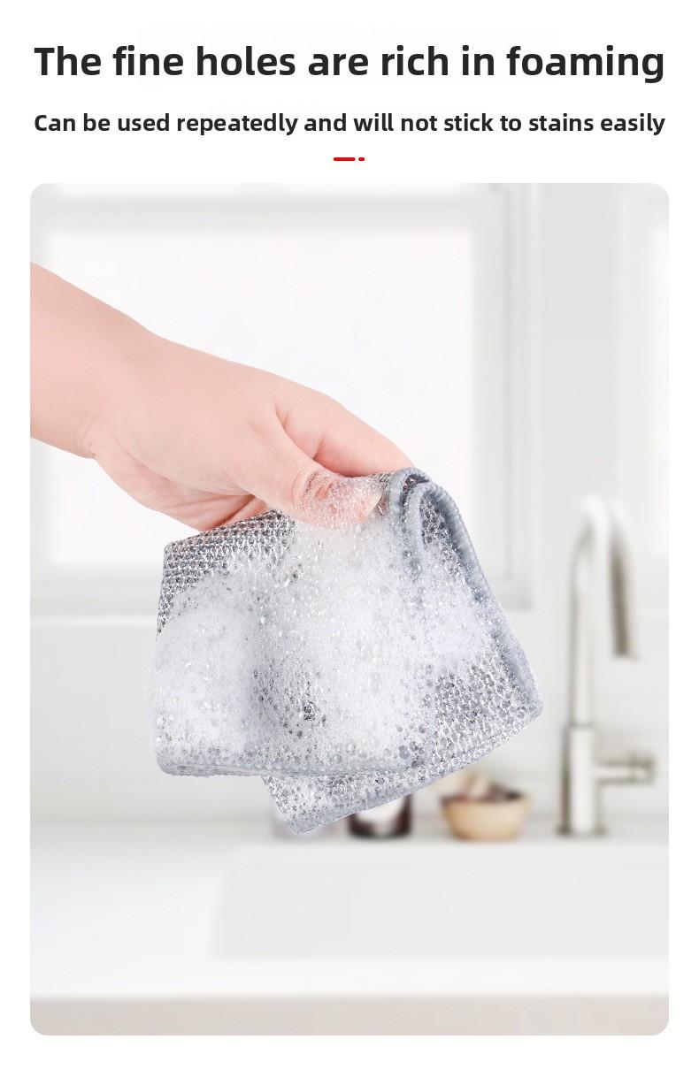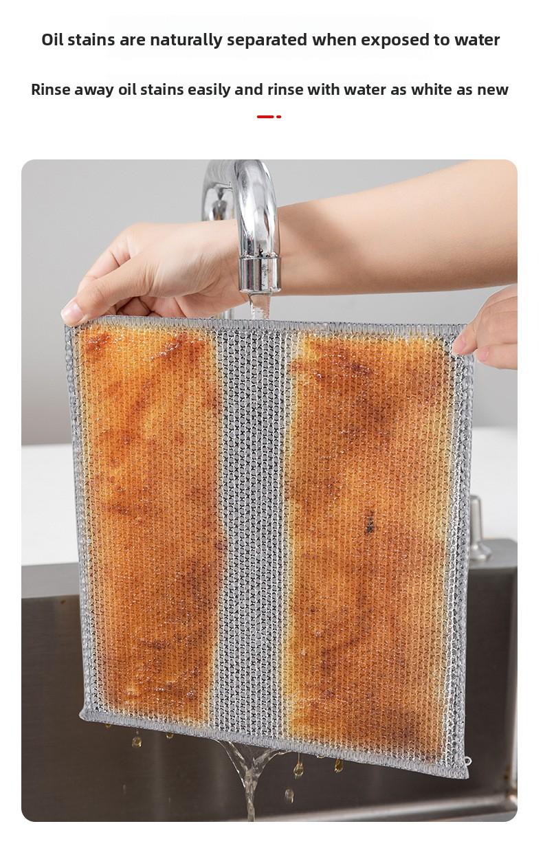 This dishcloth features a dual-sided integrated design. One side is made of high-quality fabric, while the other side consists of soft yet durable metal wires. This scratch-resistant metal wire dishcloth not only offers water absorption but also effectively removes stubborn stains. It’s reusable, allowing one cloth to be used multiple times.