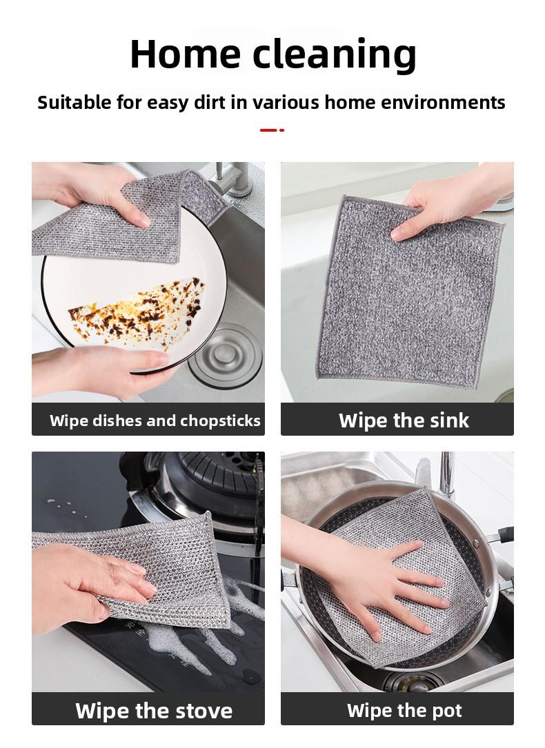 The metal wire dishwashing cloth is a great cleaning assistant. It works for kitchen cleaning tasks like tableware, sinks, stove countertops, pots, cookware, ovens, grills, etc., and household cleaning such as window glass, handrails, tabletops, bedside tables, table lamps, and more. The multi-functional metal wire magic cleaning cloth is widely applicable.