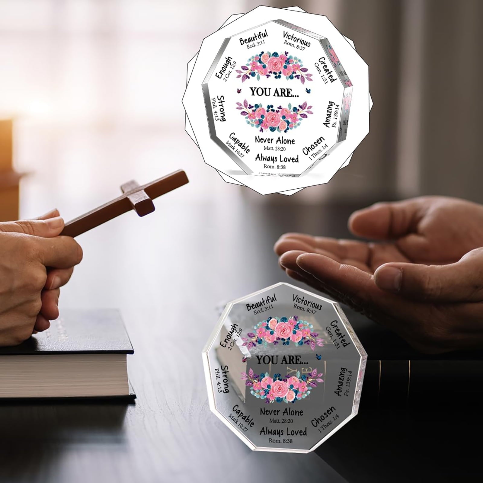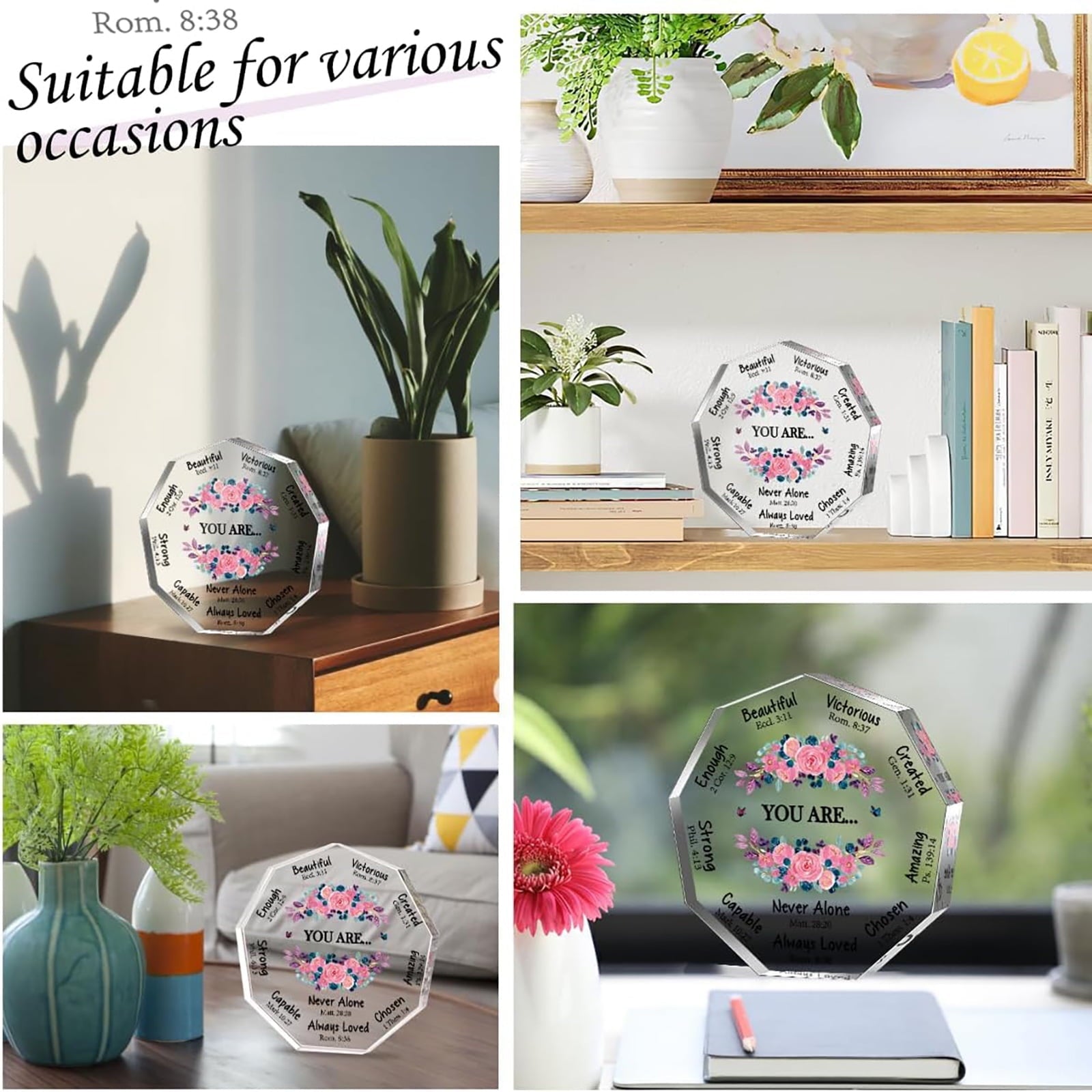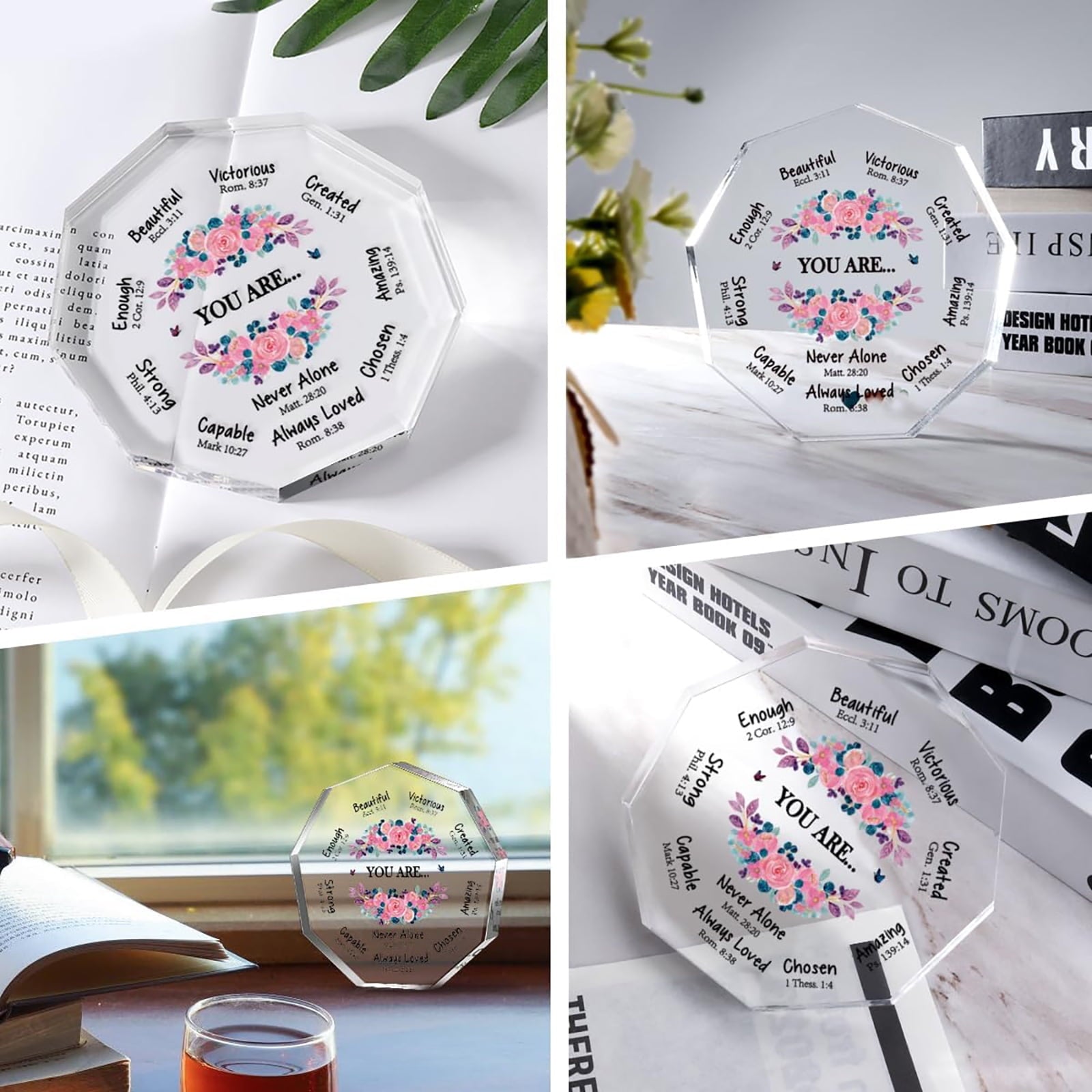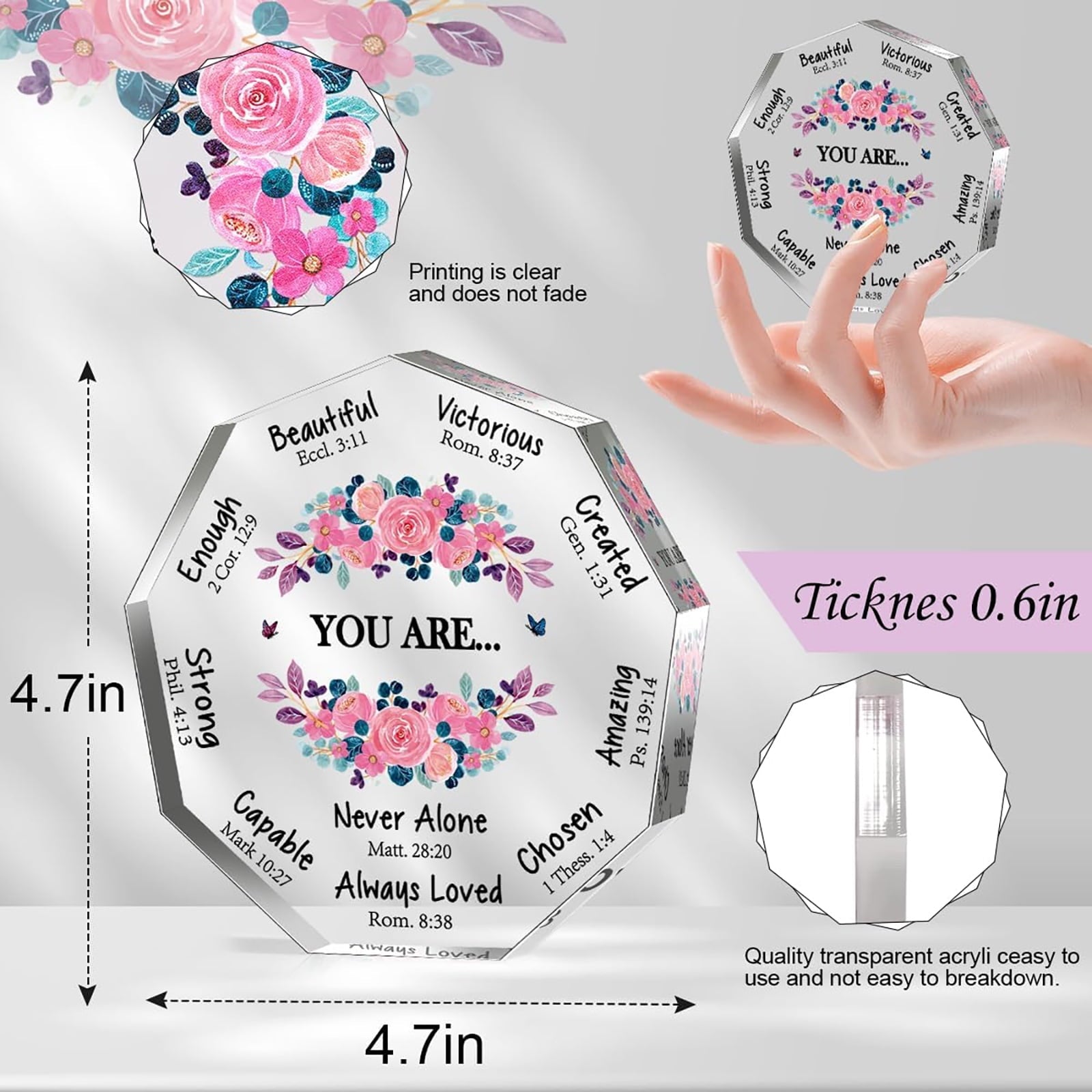 - Christian Gifts for Women - Cute Christian acrylic desk decorative is designed with nonagon shape in clear color, well printed with beautiful flowers and meaningful sentences.