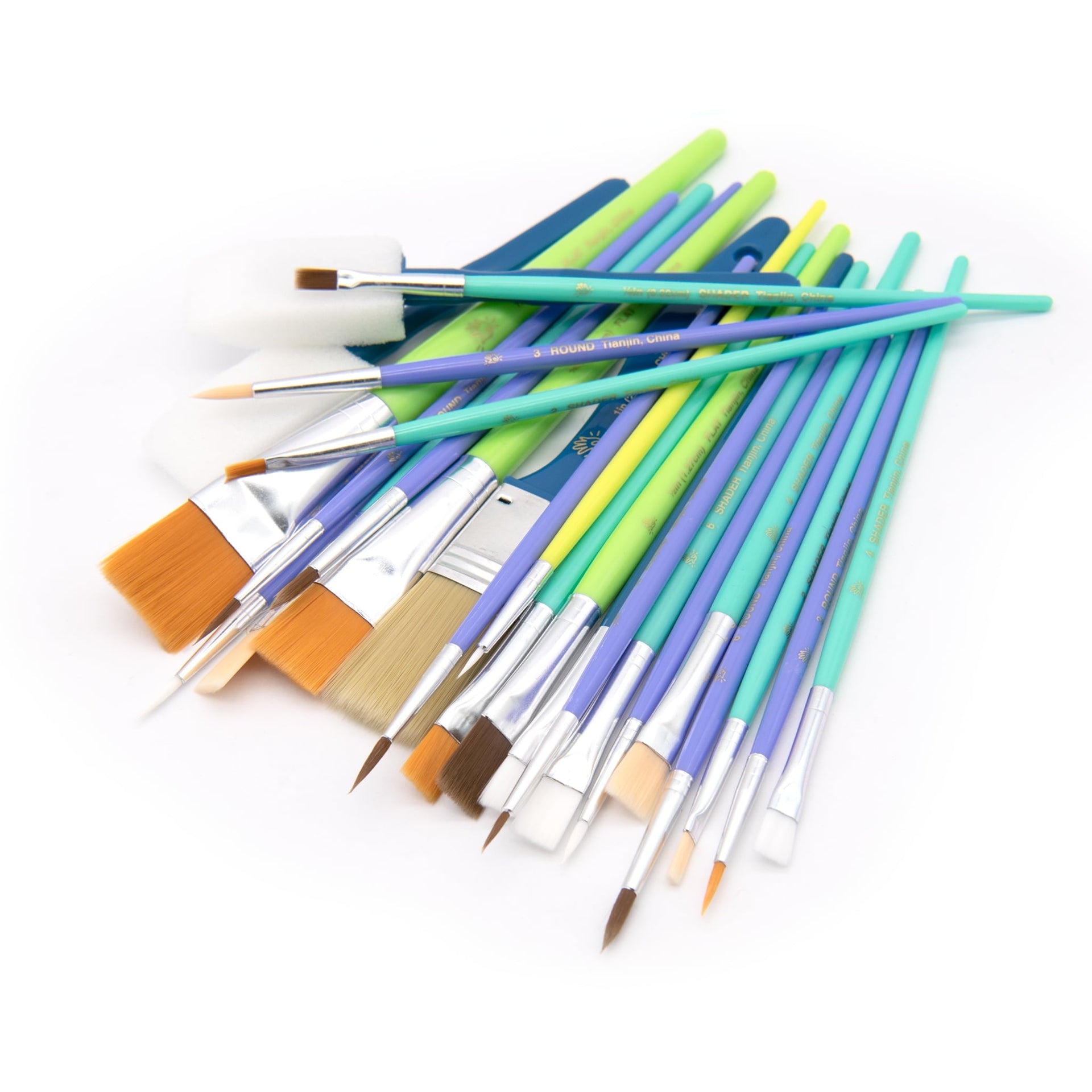 Hello Hobby's Synthetic Taklon Variety Craft Brush Set. Offering 25 different shapes and sizes of paint brushes, this set has everything needed to complete your next project! Create fine to wide lines, bold brushstrokes, blend, layer and even more! Easy to clean, durable, and ergonomic for all day crafting. Perfect for all ages and skill levels - beginner to advanced, kids to adults!