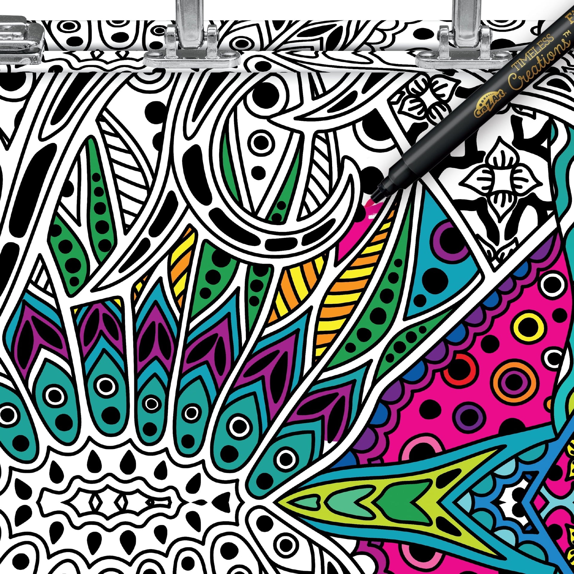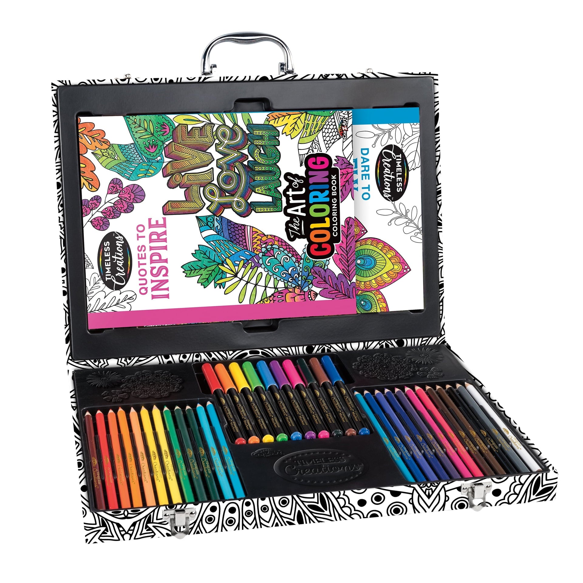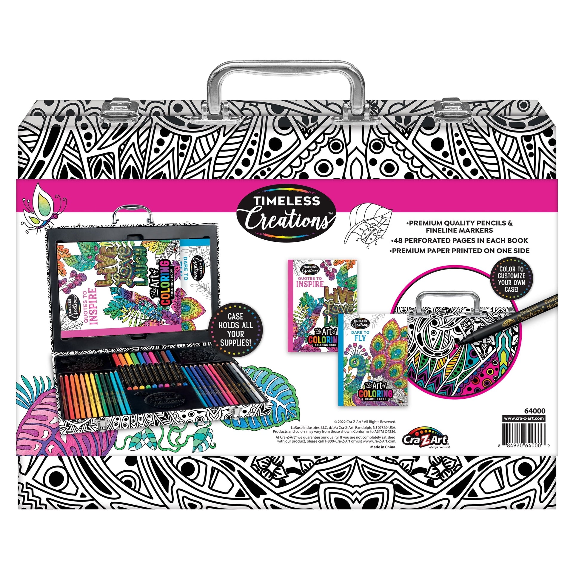 Cra-Z-Art's Timeless Creations The Art of Coloring: 37 Piece Multicolor Coloring Studio with Case is a deluxe beginner coloring set that will bring your art to life! With fully customizable colors, you can personalize your case to express your own unique style! Coloring books feature two different travel themes: "Travel in Color" and "Adventure Begins." Each page is perforated and printed on one side only on the highest quality premium paper. Prefect for teens to adults. So sit back, relax, and color your way to happiness! Check out our collection for more Timeless Creations coloring books and supplies. Be "always creative" with Cra-Z-Art!